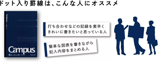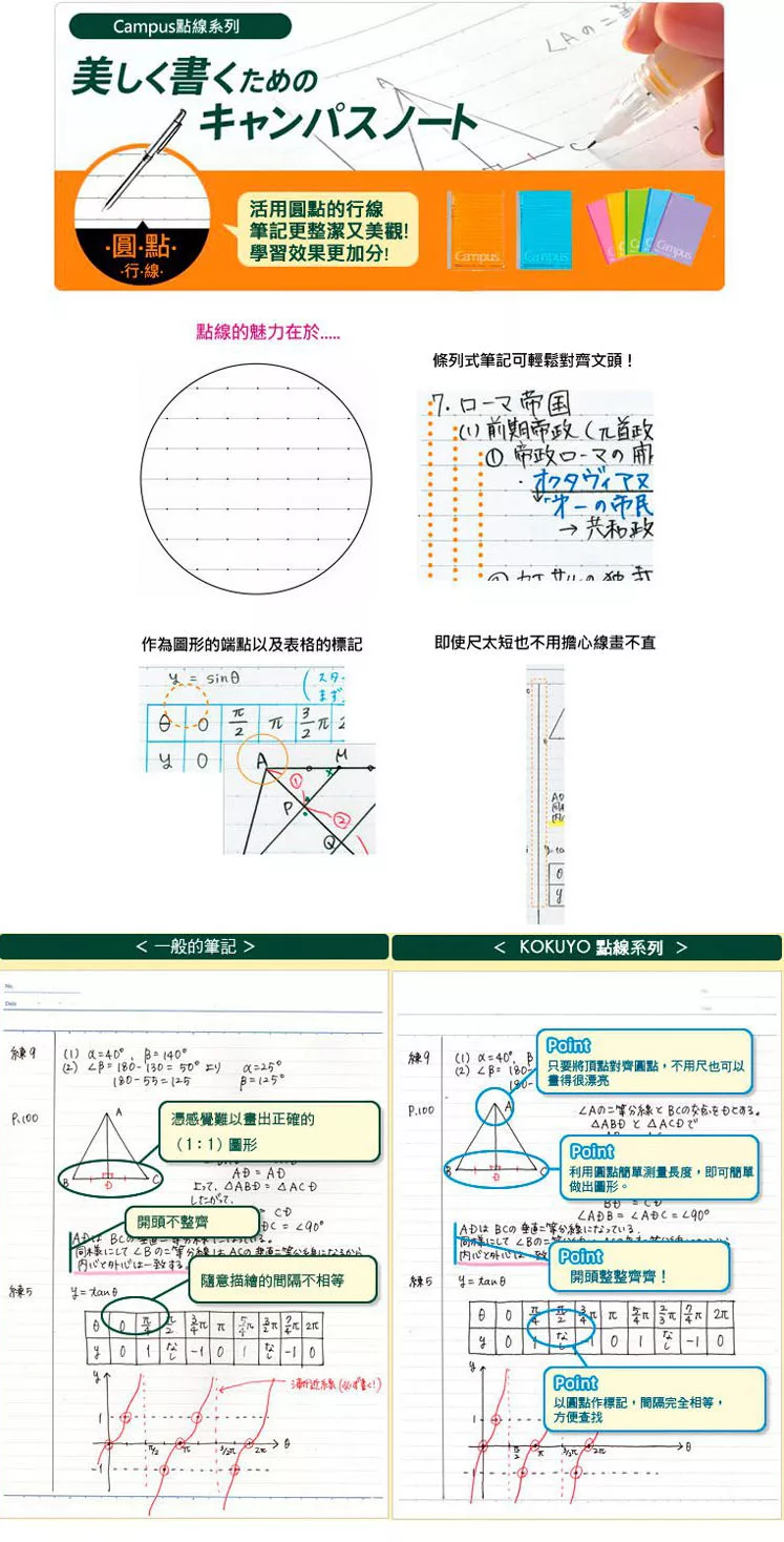 為了能讓大多數的人寫出這樣的筆記,KOKUYO在現今最通用的橫線上加上等間隔的圓點,就是這個「東大生點線系列」!點線設計,方便對齊和劃線,不用擔心字會愈寫愈歪。